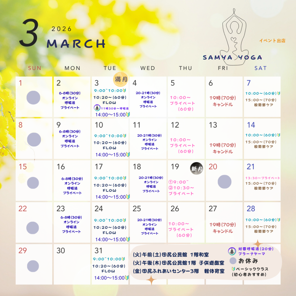 ◇9割り初心者スタート、クラスは基本的にベーシックポーズを中心にして、レベル別にアレンジしながら、各自のペースで心地よく動けることを目指して練習します